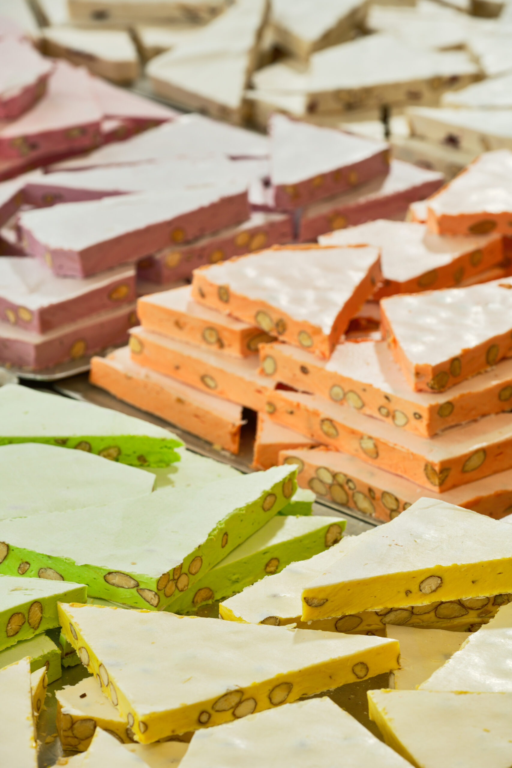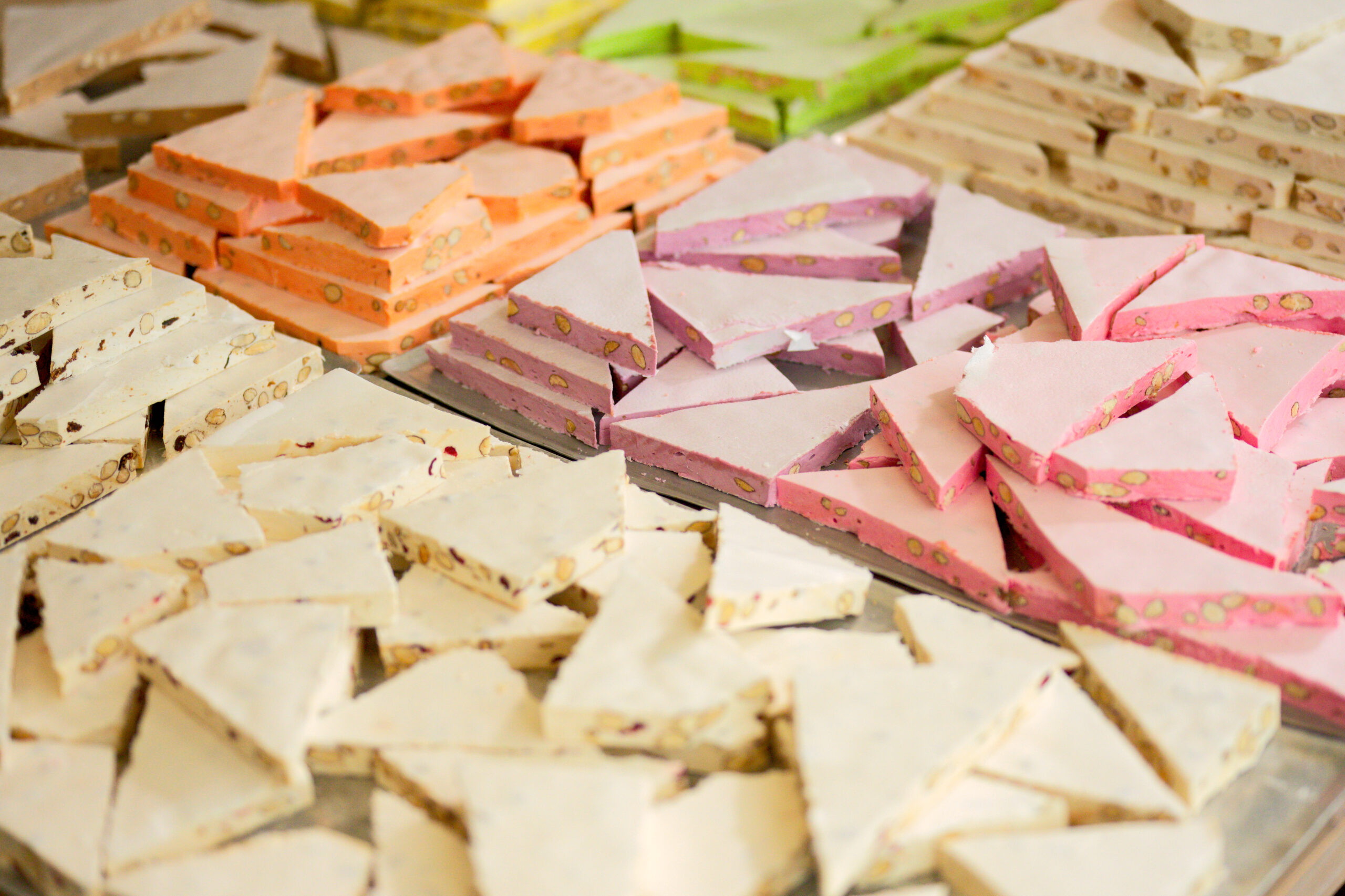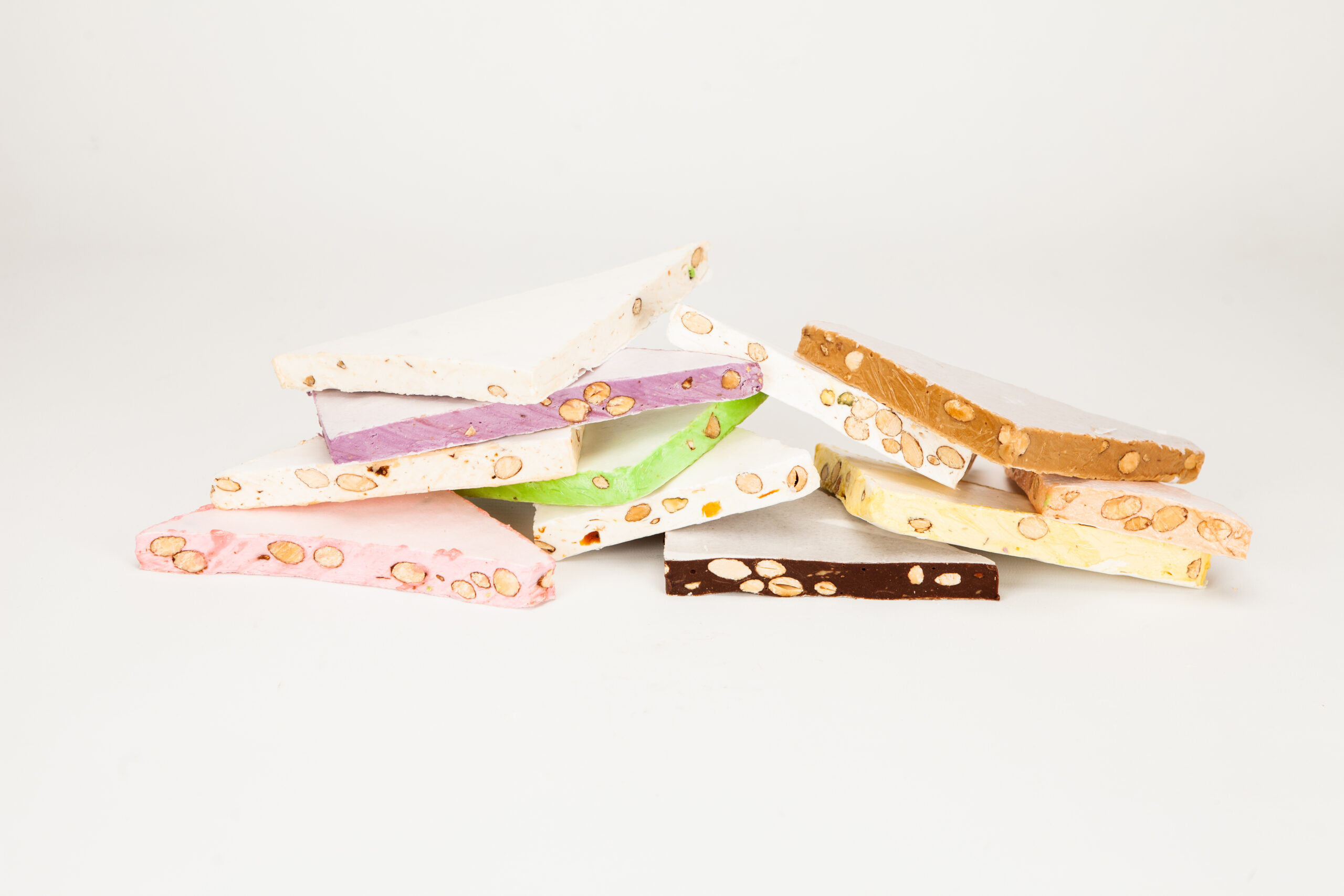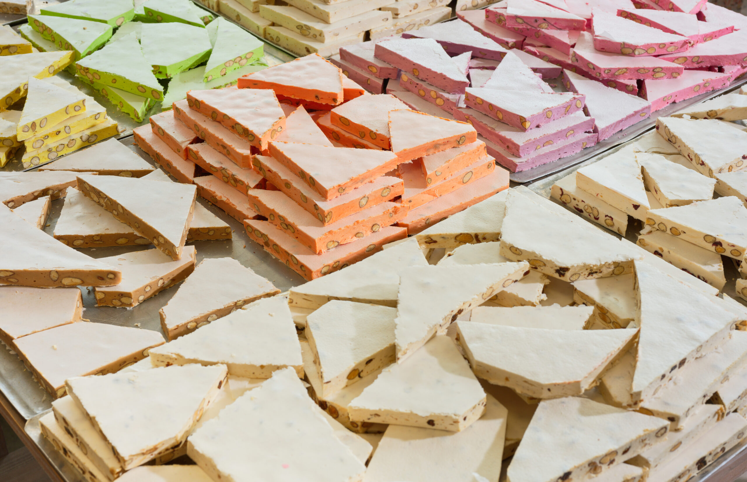Sucre, glucose, miel, blancs d’œufs, amandes grillées 15 %, pain azyme vanilline, sucre inverti, amidon (huile de noix coco), arômes : framboise, pistache, huiles essentielles d’orange et de citron. colorants : E-102, E-129, E-131.