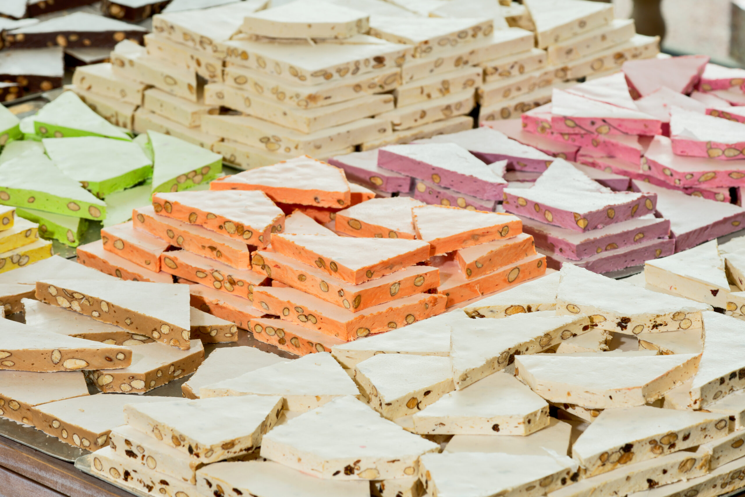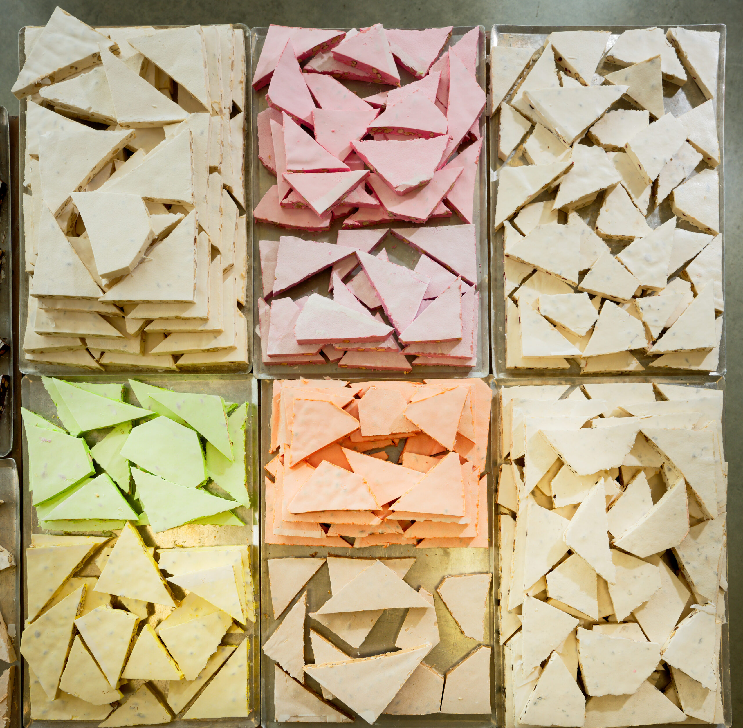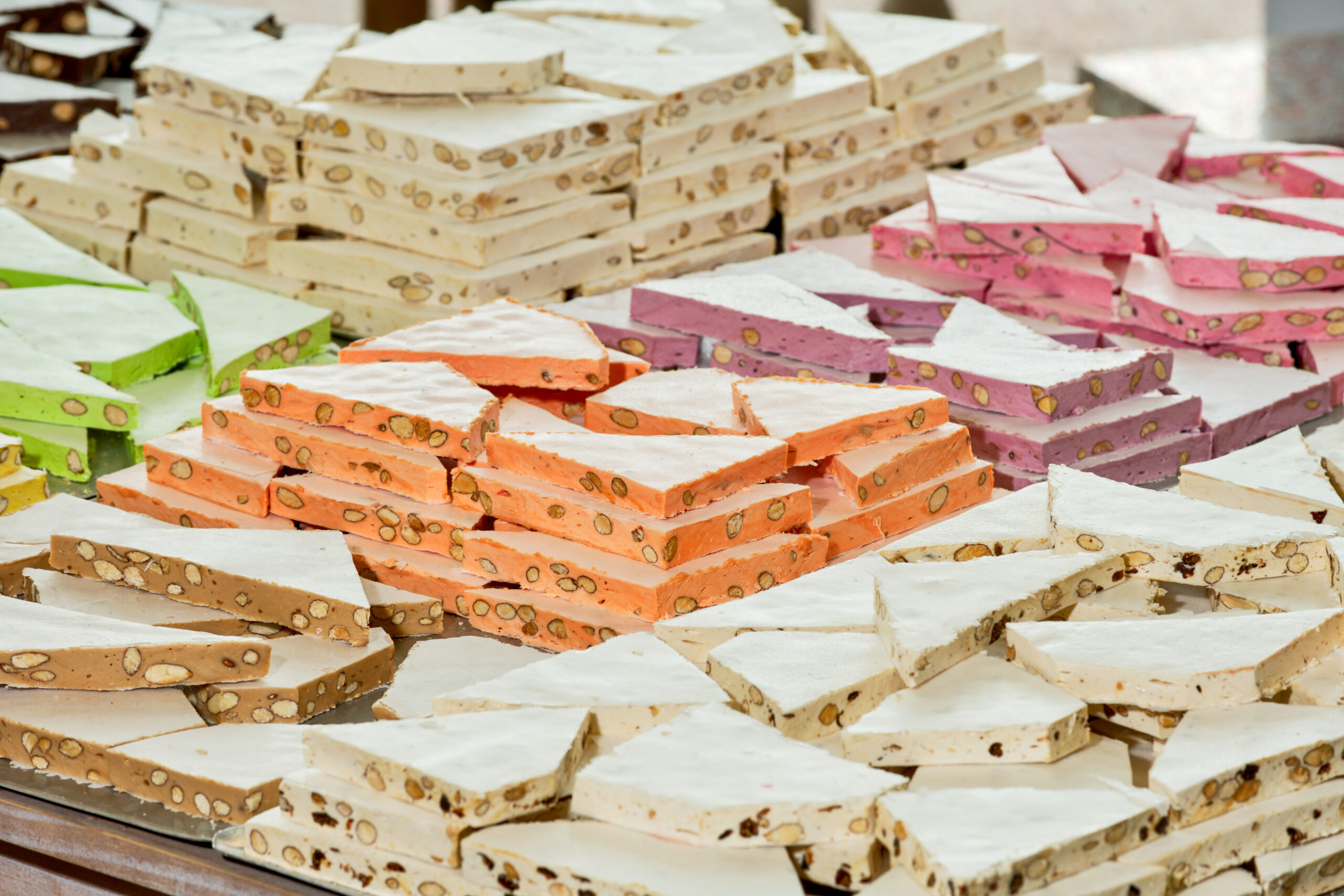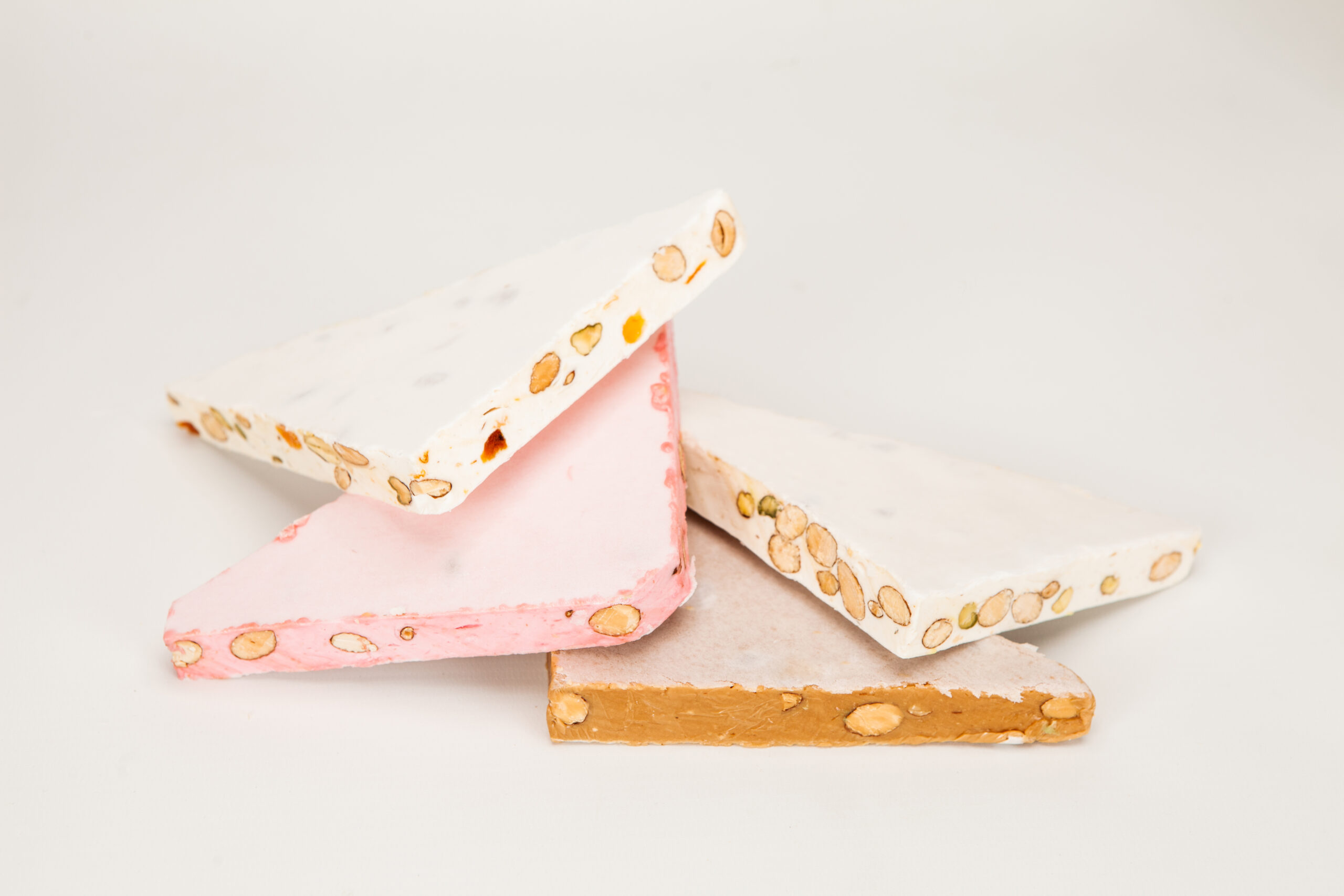 Sucre, glucose, miel, blancs d’œufs, amandes grillées 15 %, pain azyme vanilline, sucre inverti, amidon (huile de noix coco), arômes : framboise, pistache, huiles essentielles d’orange et de citron. colorants : E-102, E-129, E-131.