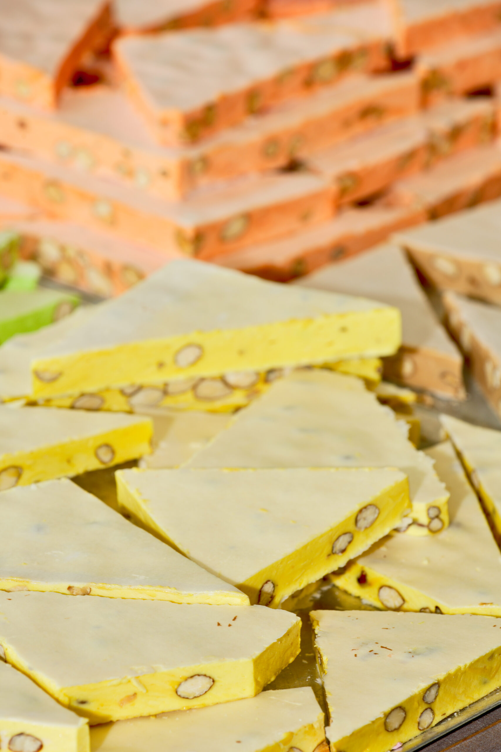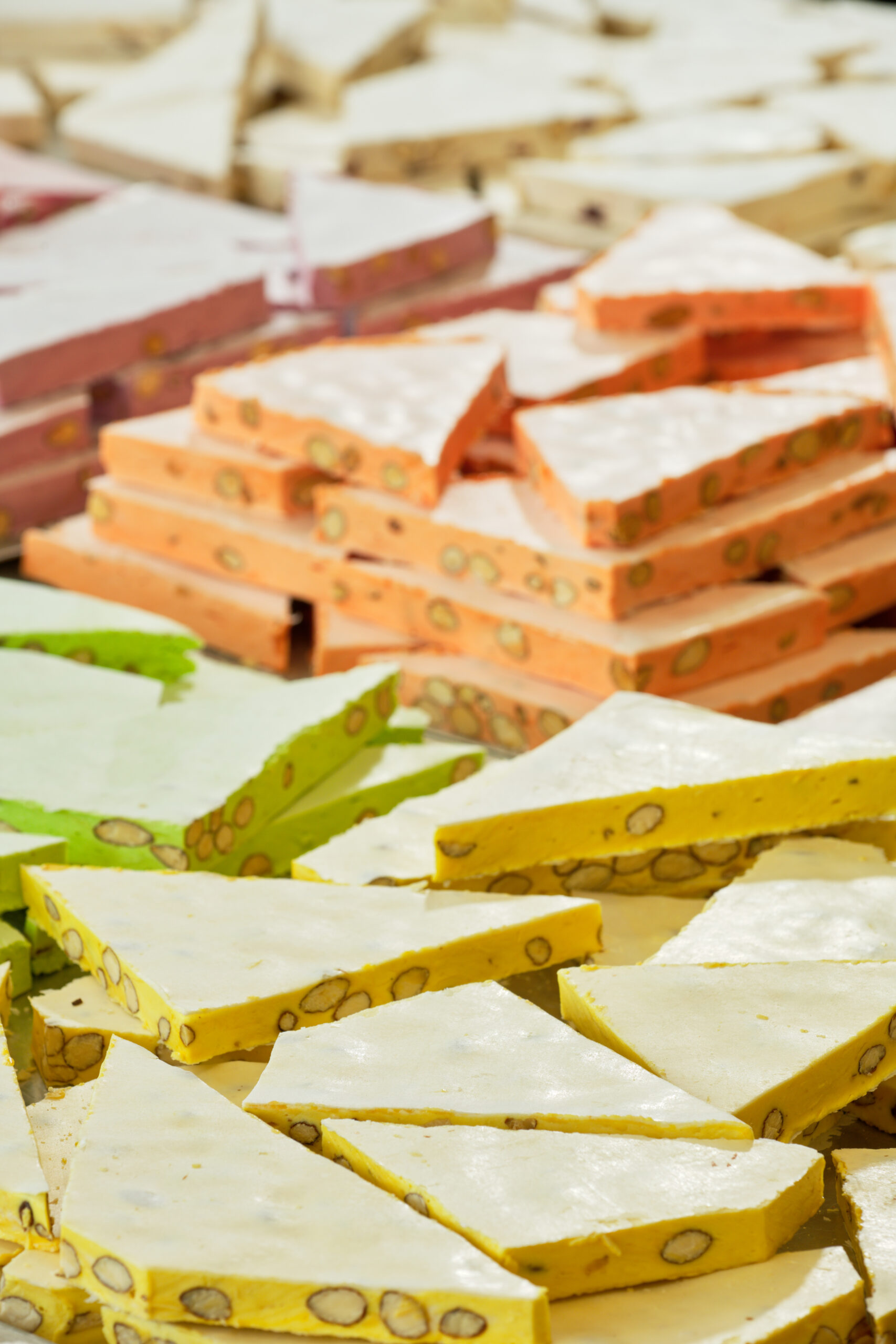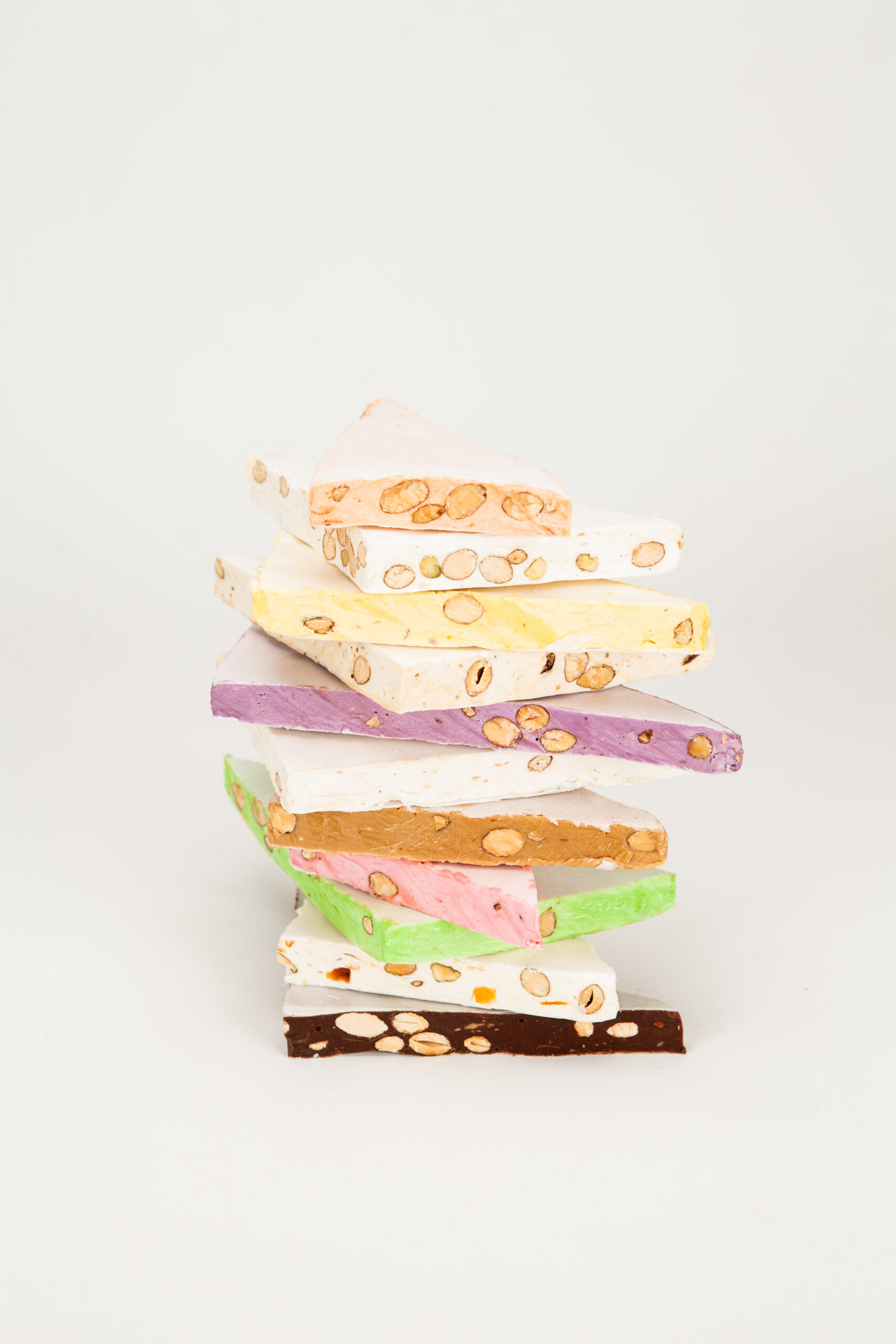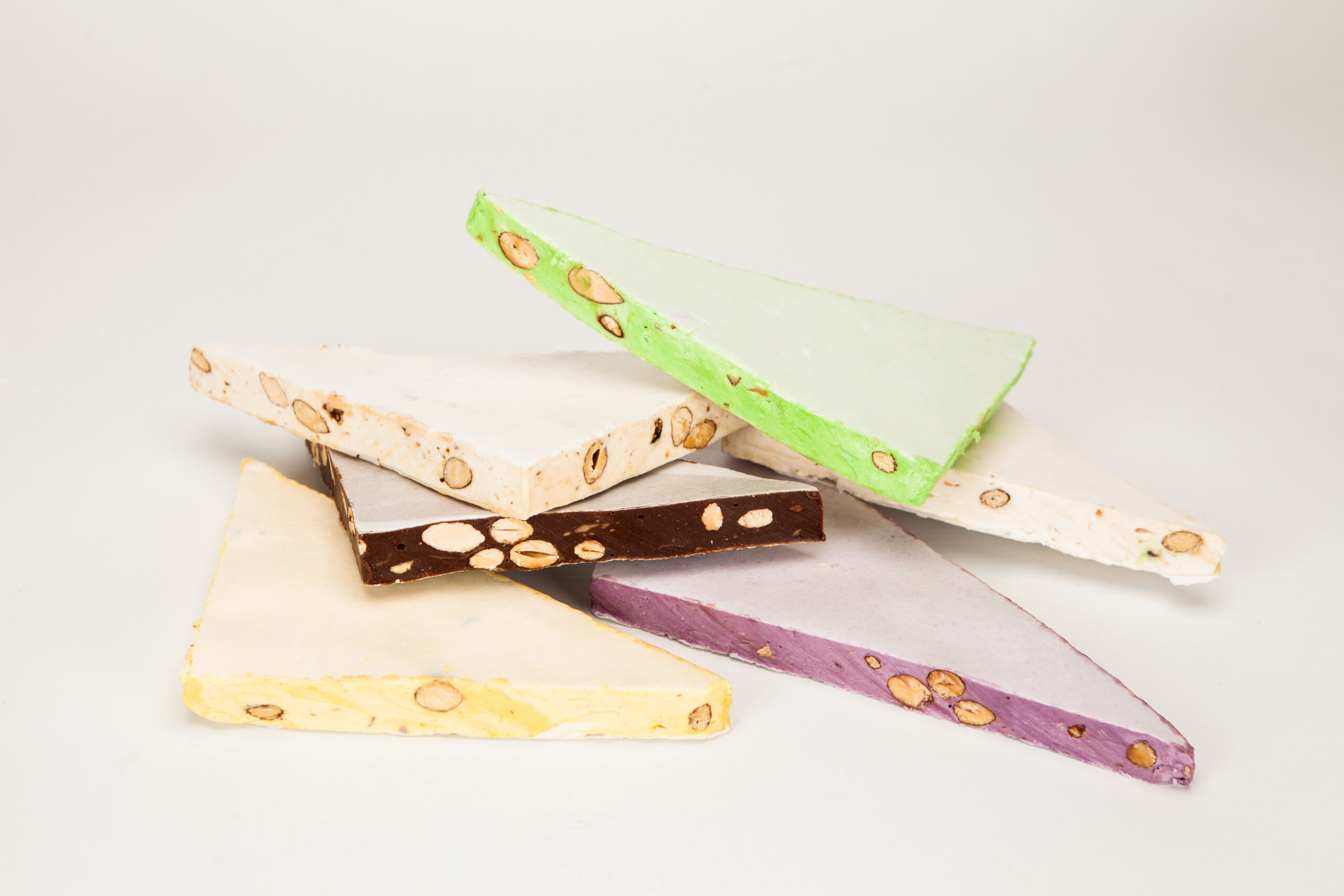 Sucre, glucose, miel, blancs d’œufs, amandes grillées 15 %, pain azyme vanilline, sucre inverti, amidon (huile de noix coco), arômes : framboise, pistache, huiles essentielles d’orange et de citron. colorants : E-102, E-129, E-131.